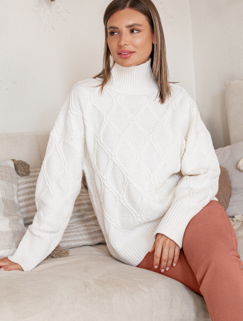 Свитер выполнен из хлопковой пряжи крупной резной вязки. Мягкая фактура свитера очень комфортная к телу, абсолютно не колется и позволяет носить изделие даже на голое тело. Добавление акрила в состав изделия способствует шелковистости и дополнительному теплу. Трендовый геометрический узор отлично впишется в осенне-зимний гардероб.