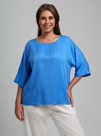 Блуза женская из гладкокрашеного тканого штапельного полотна, свободного кроя с горловиной овальной формы, обработанной окантовкой из основного материала, с цельнокроеными рукавами длиной до локтя.