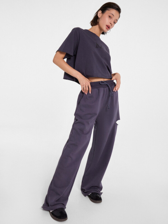 Брюки свободного силуэта из футера. Пояс отрезной из рибаны, с эластичной тесьмой внутри.