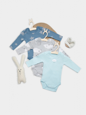 Боди выполнено из интерлока. Спинка и перед цельнокроенные. Спинка с переходящей кокеткой и цельнокроенной ластовицей. Горловина круглая, окантована бейкой из основног полотна. Припуски верхних и нижних срезов переда и спинки окантованы бейкой из основго полотна. Рукава длинные, втачные, одношовные.