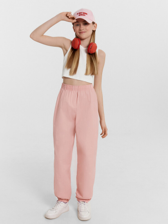 Брюки для девочек. Посадка на талии. Пояс цельнокроеный , внутрь застрочена эластичная тесьма 40RV. По переду декоративные фигурные подрезы, отстрочены . Низ изделия обработан швом в подгибку, внутрь застрочена эластичная тесьма 20RV.