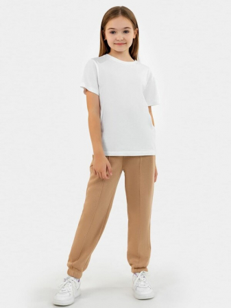 Брюки из трикотажного футера с подчесом. Силуэт свободный, на передних половинках обработаны карманы с наклонным входом. Пояс с эластичной тесьмой внутри. Низ штанин – с эластичной тесьмой, отвернут. Отличная модель для девочки!
