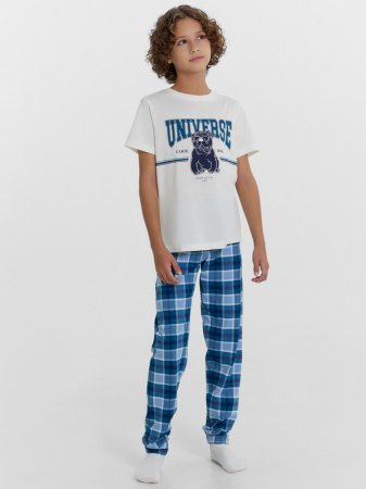 Стильная и уютная пижама для мальчиков. Выполнена из хлопковой трикотажной кулирки. Пижама состоит из футболки с коротким рукавом и длинных брюк с эластичной резиной в поясе. Штанины завершаются манжетами. Для самых комфортных снов!