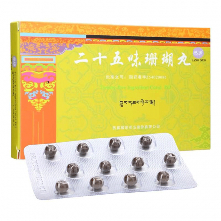 Коралловые пилюли 25 Ингредиентов Ershiwuwei Shanhu Wan Twenty-five Ingredient Coral Pill — китайский лечебный препарат для лечения сердечно-сосудистых заболеваний. Данный продукт базируется на принципах тибетской медицины, его рецепт основан на древнем тибетском рецепте из труда 8 века «Четыре медицинские Тантры» («Four Medical Tantra») и производится из редких тибетских трав, выросших «на крыше мира» в специальной экологической среде.