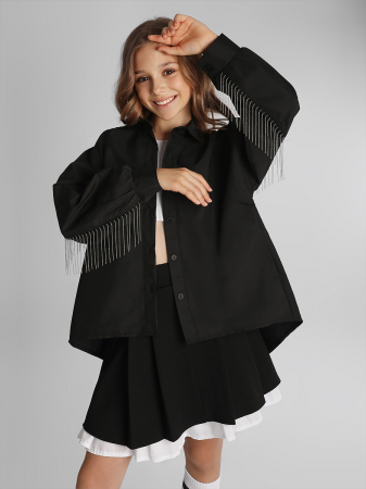 Блузка для девочки Соль&Перец, модель оверсайз, на пуговицах. Удлиненная спинка с эффектным декором и разрезом, рукав-реглан, линия плеча приспущена. Блузка прекрасно сочетается как с брюками, так и с юбкой, подчеркнёт индивидуальный стиль девочки, и разнообразит её повседневный школьный образ.