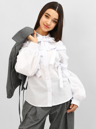 Блузка для девочки Соль&Перец, на пуговицах, из натурального хлопка. Особенностью блузки являются пышные рукава фонарики и пришитые ленты из основной ткани, которые добавляют ей изящества и уникальности. Блузка прекрасно сочетается с брюками или с юбкой, подчеркнёт индивидуальный стиль девочки, и разнообразит ее повседневный школьный образ.