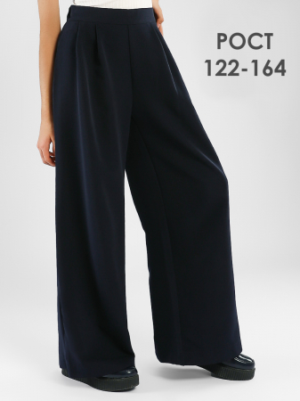 Брюки палаццо для девочки школьные Соль&Перец. Модель имеет расширяющийся от бедра силуэт, что визуально вытягивает фигуру. Брюки застёгиваются на потайную молнию сбоку, сзади в пояс вшита резинка. Брюки выполнены из износостойкой костюмной ткани «Босс» которая долго сохраняет форму и привлекательный внешний вид.