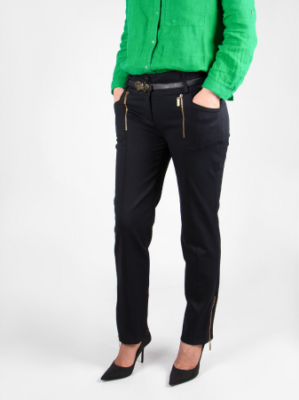 Брючины немного заужены, средняя посадка, широкий, комфортный пояс, и декоративные металлические молнии.
