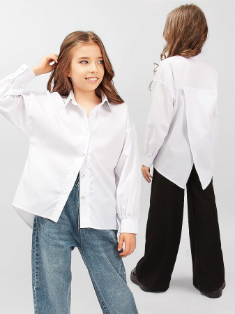 Блузка Соль&Перец модель оверсайз для девочек и подростков на пуговицах. Удлиненная спинка, плечо немного приспущено, рукава заканчиваются манжетой. Блузка прекрасно сочетается как с брюками, так и с юбкой, подчеркнет индивидуальный стиль девочки, и разнообразит ее повседневный школьный образ.