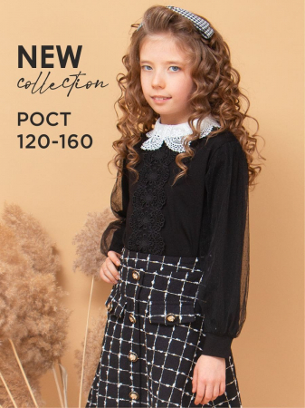 Элегантная блузка прямого силуэта для девочки. Передняя часть декорирована кружевом, отложной воротник выполнен из кружева, рукава украшены мягким фатином, на спинке застёжка-пуговица. Мягкий, приятный к телу трикотаж, обеспечит идеальную посадку изделия по фигуре. Прекрасный выбор для создания красивого школьного образа.