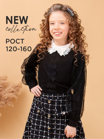 Элегантная блузка прямого силуэта для девочки. Передняя часть декорирована кружевом, отложной воротник выполнен из кружева, рукава украшены мягким фатином, на спинке застёжка-пуговица. Мягкий, приятный к телу трикотаж, обеспечит идеальную посадку изделия по фигуре. Прекрасный выбор для создания красивого школьного образа.