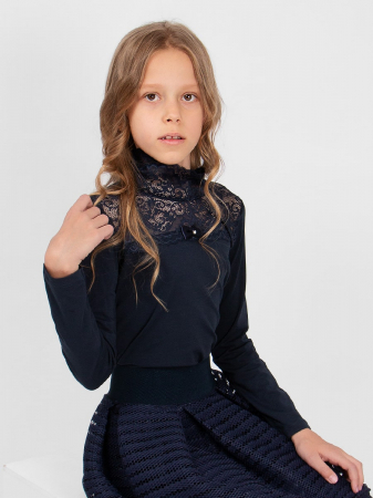 Школьная блузка с длинным рукавом и воротником-стойкой. Верхняя часть и воротник выполнены из нежного кружева. Мягкий, приятный к телу трикотаж обеспечит идеальную посадку изделия по фигуре. Модель прекрасно подчеркнет индивидуальный стиль девочки, и разнообразит ее повседневный школьный образ.