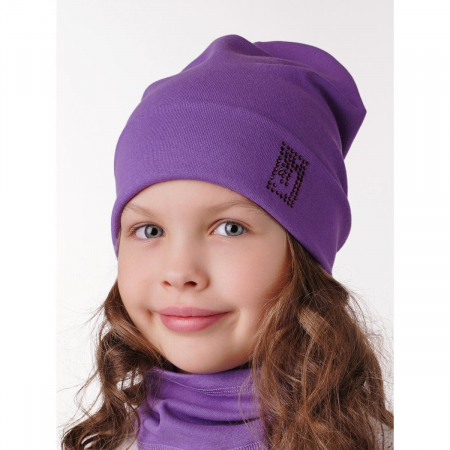 Двойная шапочка, из трикотажного полотна с отворотом. Декорирована фирменным лейблом из страз. Подойдет на температуру от 0 до + 10 градусов.