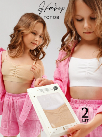 Топ для девочки, с тонкими бретелями, со съёмными вкладышами из поролона, по низу широкая эластичная резинка. Выполнен из натурального хлопка, нежного и приятного для чувствительной детской кожи. Отличный выбор современного и комфортного нижнего белья, который оценит каждая девочка.