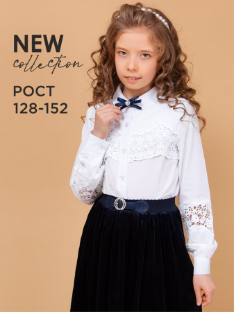 Блузка на пуговицах приталенного силуэта. Пуговицы дополнены стразами, передняя часть и рукава декорированы кружевом и вышивкой. Модель дополнена съёмной брошью. Классический элемент школьной формы прекрасно вольется в гардероб каждой девочки.