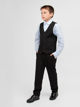 Жилет и брюки выполнены из высококачественной костюмной ткани. Жилет на пуговицах, обхват регулируется с помощью ремешков. Низ брючин не подшит.