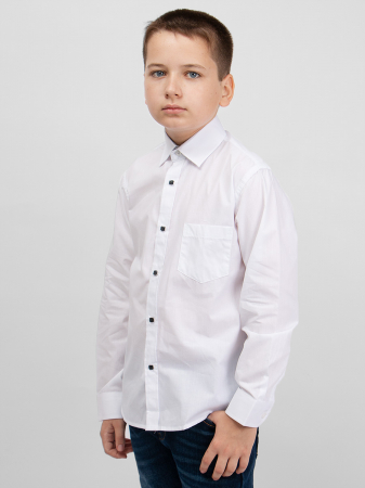 Классическая белая рубашка прямого силуэта с нагрудным карманом. Модель идеально сочетается с брюками любого фасона и подойдет как для школы, так и для торжественного мероприятия.