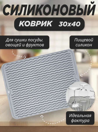 Коврик для сушки посуды, а так же фруктов и овощей. Необходимая вещь на кухне для каждой хозяйки. Цвет серый. Коврик ребристый, рельефный, силиконовый. Мягкая поверхность защищает посуду от сколов. Вода свободно стекает в желоба, а после ее легко стряхнуть в мойку. Бортики по краям защищают стол от намокания.