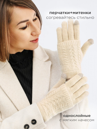 Перчатки женские, однослойные, из вязаного трикотажа, в комплекте с митенками, которые можно носить, как отдельно от изделия, так и вместе. Перчатки отлично сохраняют тепло и защищают руки от мороза в холодное время года. Большой и указательный пальцы адаптированы для использования сенсорного телефона.