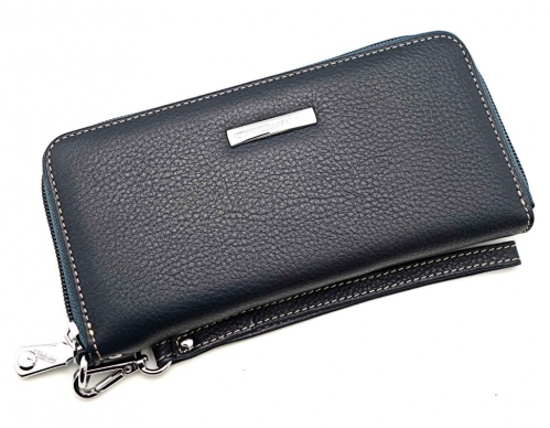Изготовлено из высококачественной кожи тёмно-синего цвета. Размер 19 х 9,5 см. Закрывается на молнию. Внутри - три отделения и два кармана для купюр, отделение для монет на молнии, 15 кармашков для пластиковых карт. Снаружи: на оборотной стороне карман на молнии, в нижней левой части металлическое полукольцо для крепления кожаного ремешка с карабином.
