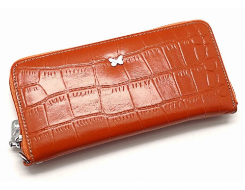Закрывается на молнию. Внутри - три отделения и два кармана для купюр, отделение для монет на молнии, 15 кармашков для пластиковых карт. Снаружи: на оборотной стороне карман на молнии. В комплекте съемный, кожаный ремешок на запястье.
