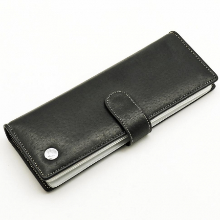 Женская визитница из комбинированной кожи от Sergio Valentini. Внутренняя отделка из искусственной кожи. Альбом с двадцатью двойными прозрачными файлами для визитных карточек. Закрывается на хлястик с кнопкой. На внутренней стороне левой створки продольный карман, семь кармашков для карточек и прозрачное окошко для фотографии. На правой створке- прозрачный карман.