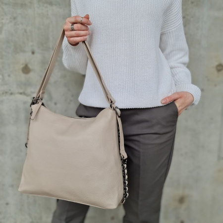 Женская сумка-трансформер из натуральной матовой кожи бежевого цвета.