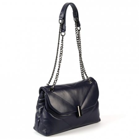 Женская сумка из натуральной кожи синего цвета. Закрывается на клапан с рамочным замком и молнию. Внутри отделение, разделенное карманом на молнии по середине и боковые кармашки, один на молнии и два открытых. Сумка имеет две ручки-цепочки высотой 32 см., которые трансформируются в один наплечный ремешок.