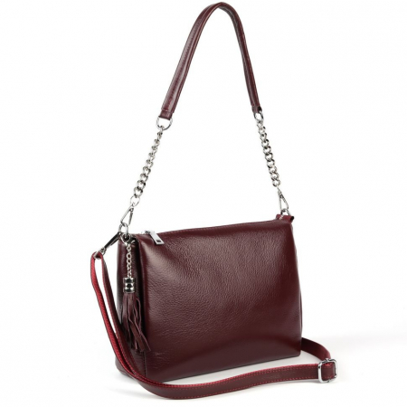 Женская сумка из натуральной кожи бордового цвета. Закрывается на молнию. Внутри три отделения, два открытых и центральное на молнии. Внутри центрального отделения есть боковые кармашки, один на молнии и два открытых. Снаружи, на задней стенке есть кармашек на молнии. В комплекте короткий ремешок с цепочкой и регулируемый по длине наплечный ремень. Сумка имеет съемный брелок с кожаной кисточкой.