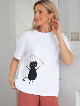 Особое внимание привлекает стильный принт в виде кота и сердечек с минималистичной надписью. Перевод надписи Start your day with a smile - Начни свой день с улыбки. Принт выполненны красками с устойчивым покрытием, который добавляет изделию оригинальности и позволяет выразить индивидуальность.