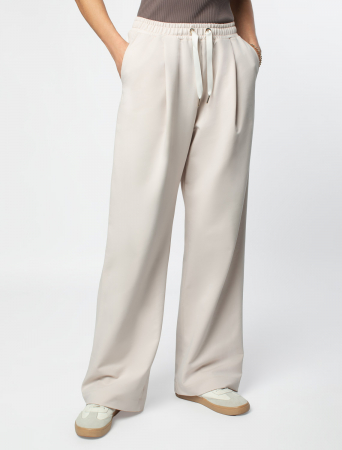 Брюки свободного кроя выполнены из эластичного футера-двухнитки. Модель дополнена защипами и боковыми карманами как у классических брюк и одним задним карманом. Эластичный пояс на резинке с шнурком из репсовой ленты и металлической фурнитурой. Брюки сочетаются в костюме с футболкой D49.031, D49.085, бомбером D49.038 и паркой D49.075