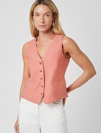Жилет выполнен из плотного лиоцелла. Модель украшена черепаховыми пуговицами в золотистой окантовке. Ткань изделия отлично держит форму и не просвечивает. В теплое время года приятно охлаждает кожу. Добавление синтетических волокон в составе изделия, предотвращает сминаемостьи поддерживает формоустойчивость. Жилет сочетается в костюме с брюками D24.261, D24.267, D24.265, юбкой D24.261, D26.196, шортами D27.002, а также очень эффектно с белыми шортами и джинсами.