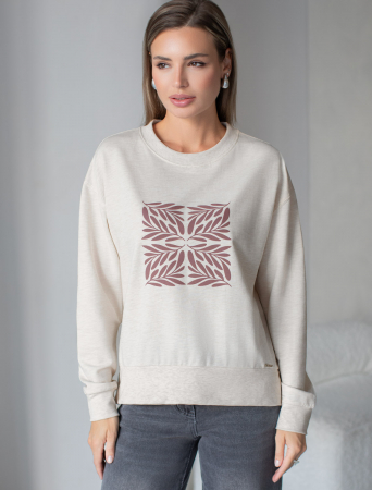 Стильный свитшот бежевого цвета с эффектом меланж из премиального футера двухнитки с эластаном сочетает в себе комфорт и оригинальность. Джемпер выполнен из натурального хлопка, который обеспечивает мягкость и дышащие свойства ткани. Нежный материал дарит ощущение уюта в любое время года, а премиальное качество изготовления гарантирует долговечность и сохранение формы после множества стирок. Особенность изделия — спущенная линия плеча и аккуратные разрезы, которые добавляют современный акцент и делают образ более выразительным. Принт в виде листиков придает индивидуальность, позволяя выделиться без лишней вычурности. Дополнен металлическим логотипом бренда.