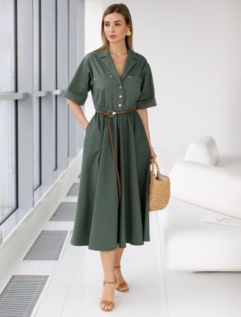 Платье в стиле сафари выполнено из хлопкового твила. Изделие дополнено тонким ремешком из эко-кожи, боковыми и нагрудными карманами, подворотами на рукавах. Застежка на пуговицы спереди. Благодаря наличию эластана в составе изделие сохранит свой безупречный внешний вид в течение долгого времени. Обладает высокой воздухопроницаемостью, в платье будет комфортно даже в жаркое время года.