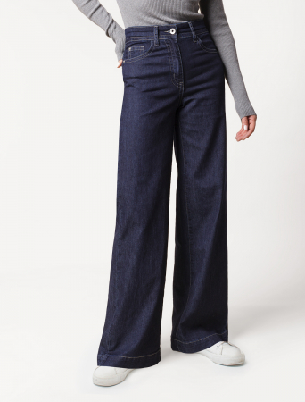 Широкие джинсы-трубы выполнены из эластичного денима. За счет высокой посадки и свободного кроя визуально удлиняют ноги. Модель в темно-синем оттенке со стиркой по праву считается универсальной, так как сочетается почти со всеми цветами, благодаря чему легко подобрать верх. Ткань очень хорошо тянется и не сковывает движений. На поясе сзади расположен нашивка из эко-кожи с логотипом бренда