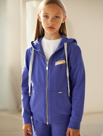 Лавандовое худи на молнии с длинными рукавами и спущенной линией плеч сшито из премиального хлопкового футера. Материал отлично поддерживает циркуляцию воздуха, а крой не ограничивает движения. Модель с высококачественной золотистой фурнитурой украшена устойчивым принтом. Идеально в костюме с брюками F44.060