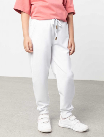 Белые джоггеры сшили из мягкого хлопкового трикотажа. Премиальный футер из 100% хлопка позволяет воздуху циркулировать и не раздражает кожу, а свободный крой модели не сковывает движения. За удобную посадку на талии отвечает широкий эластичный пояс с регулируемым шнурком. Модель дополнена высококачественной фурнитурой золотистого цвета. Идеально в костюме с худи F49.405