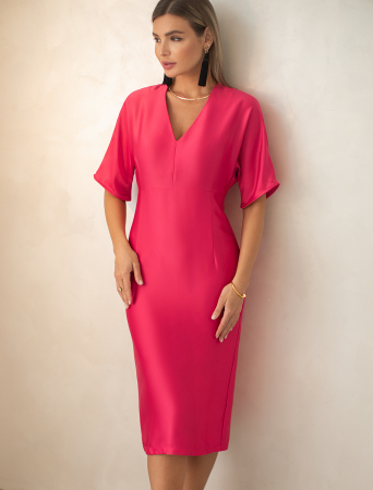 Платье с глубоким V-вырезом и рукавом «летучая мышь» выполнено из тончайших нитей плотного сатина, плетение которых создает полуматовый блеск, напоминающий натуральный шёлк. Модель с длинными глубокими вытачками спереди и сзади выглядит скульптурно, но за счет струящейся ткани сохраняется плавность силуэта. Ткань почти не мнется и имеет легкий вес. Комфортная длина ниже колена и застежка на молнию.
