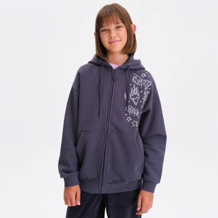 Состав: 66%хлопок 34%полиэстерОписание: Удобная толстовка для девочки свободного силуэта из мягкого смесового футера с начесом — теплая и приятная на ощупь. Модель с мягким, спущенным плечом и застежкой на молнию легко надевается и создаёт расслабленный стиль. По низу и рукавам — эластичные манжеты из рибаны, которые отлично держат форму и делают посадку ещё комфортнее. Спереди расположены практичные накладные карманы-кенгуру, в которых удобно хранить мелочи или согревать руки. Капюшон двойной, с регулировкой на шнурок — можно подстроить под себя для дополнительного уюта и защиты от ветра. Особая деталь — стильный принт из металлических страз, который добавляет яркости и модного блеска вашему образу. Эта толстовка — идеальный выбор для тех, кто ценит комфорт и хочет выглядеть стильно и современно каждый день. Не забывайте о выборе правильного размера. Используйте таблицу размеров на фотографии, чтобы выбрать подходящий вариант. Обратите внимание, что цвет товара на экране вашего устройства может отличаться от реального.