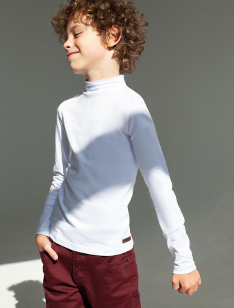 Белую водолазку выполнили из мягкого трикотажа. Премиальное качество хлопковых волокон в составе хорошо пропускают воздух, а благодаря эластану материал слегка тянется, не сковывая движения. Изделие украшено фирменным логотипом бренда. Классическая водолазка хорошая пара к школьному дресс-коду, а также в ансамбле с джинсами.