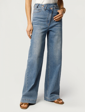 Джинсы-трубы в синем оттенке выполнены из эластичного денима. Модель с трендовой ассиметричной застежкой и декоративной стиркой эффектом делаве. Свободный силуэт и акцент на талии визуально вытягивают силуэт и подчеркивают достоинства фигуры. Изделие дополнено брендированным патчем.