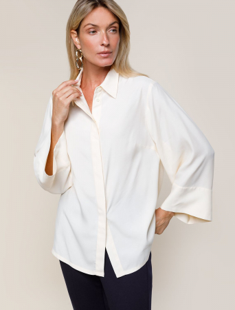 Блузка с отложным воротником и свободными укороченными рукавами выполнена из лиоцелла с вискозой. Лаконичная модель без декора, дополнена застежкой на пуговицы из натурального перламутра под планкой. Просторный крой не стесняющий движений подходит для любой фигуры с не широкими низами в заправку или поверх.