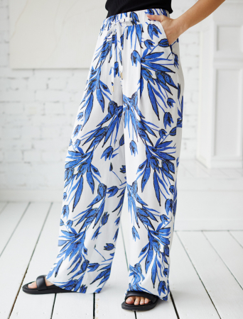 Брюки выполнены из вискозы с лиоцеллом. Изделие дополнено эластичным поясом с регулируемым шнуром. Ткань изящно блестит и приятно охлаждает кожу в жаркое время года. Модель сечетается в костюме с топом D23.062 и блузкой D29.263