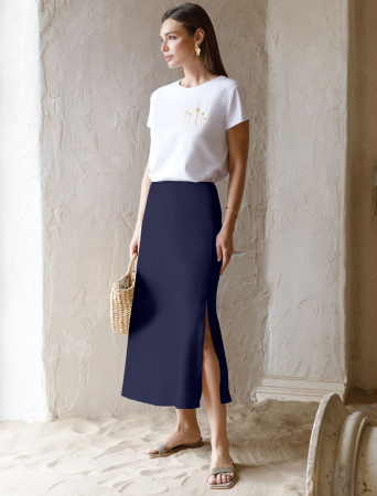 Юбка с разрезом выполнена из плотного лиоцелла. Модель, скроенная по косой мягко, струится по телу и отлично драпируется. Удобный пояс на эластичной резинке. В теплое время года ткань приятно охлаждает кожу. Добавление синтетических волокон в составе изделия, предотвращает сминаемостьи поддерживает формоустойчивость. Юбка сочетается в костюме с топом D23.063, блузкой D29.266, D29.267 и жилетом D27.002