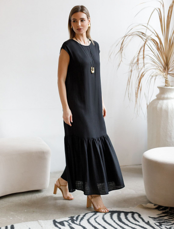 Платье длины миди прямого кроя с пышным воланом выполнено изо льна с вискозой. Сзади застежка на пуговицу из натурального перламутра. Лён в составе обеспечивает прочность и воздухопроницаемость, вискоза эластичность и гладкость ткани. Благодаря такому сочетанию изделие хорошо драпируется, меньше мнется и сохраняет форму в течении долгого времени. Свободный крой подходит для любой фигуры.