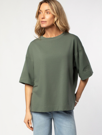 Футболка свободного кроя выполнена из премиального хлопка. Модель дополнена вышивкой логотипа бренда на рукаве. Наличие эластана в составе изделия гарантирует комфорт и формоустойчивость. Подходит для любого типа фигуры.