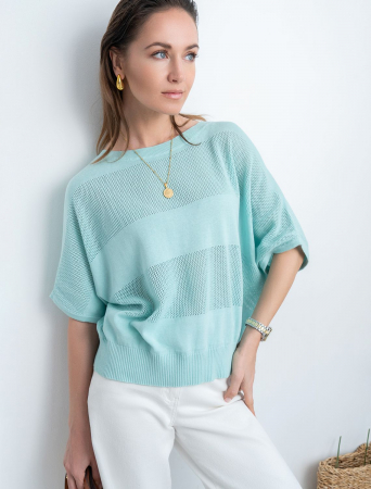 Джемпер выполнен из хлопка с вискозой и фактурными полупрозрачными полосками. Свободная модель подходит для любой фигуры. Идеально подойдет в теплую летнюю погоду, в изделии будет комфортно и не жарко. В сочетании с белым денимом получится завершенный расслабленный образ. Модель украшена металлическим логотипом бренда.