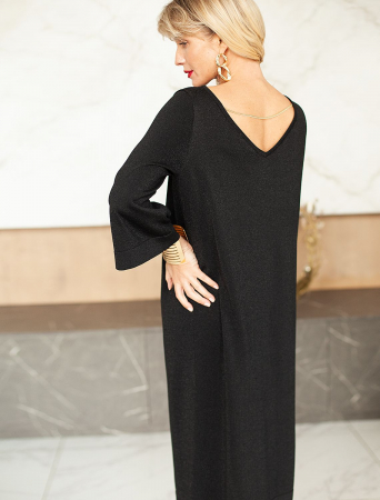 Свободное платье тонкой вязки из вискозы с добавлением мягкого люрекса. V-вырез на спинке изделия изящно притягивает внимание. Дополнительной изюминкой является тонкая цепочка, касающаяся лопаток. Внутренняя сторона изделия без люрекса, абсолютно гладкая и комфортная даже на голое тело. Совет стилиста: платье не требует к себе дополнительных аксессуаров, сочетайте свободную модель с босоножками на тонком ремешке или лодочками.