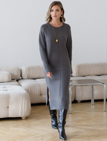 Платье длины миди выполнено из мягкой меланжевой пряжи с кашемиром. Модель прямого силуэта дополнена одиночным высоким боковым разрезом. Вязаный кант вертикально проходящий по всему изделию, визуально стройнит и вытягивает силуэт. При желании можно подчеркнуть линию талии, используя контрастный пояс.
