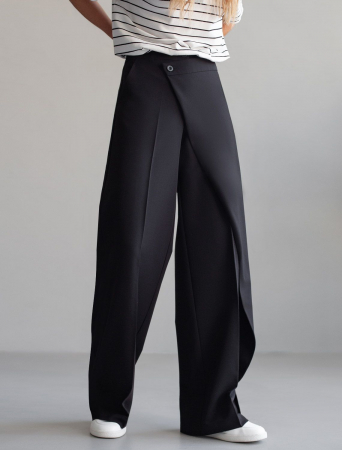 Брюки свободного кроя выполнены из эластичной поливискозы. Модель с трендовой застежкой на запАх моментально делает образ стильным, скрывает недостатки и подчеркивает достоинства фигуры. Легкая и струящаяся ткань идеально подойдет для повседневных образов и впишется в офисный дресс код. Свободный силуэт подходит для любой фигуры.